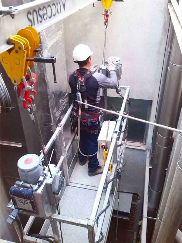 The Accesus suspension beam-davit is a system without counterweights for hanging platforms and suspended scaffolds that are usually installed on roofs, terraces and rooftops for inspection and maintenance work in confined spaces such as patios, wells and warehouses.