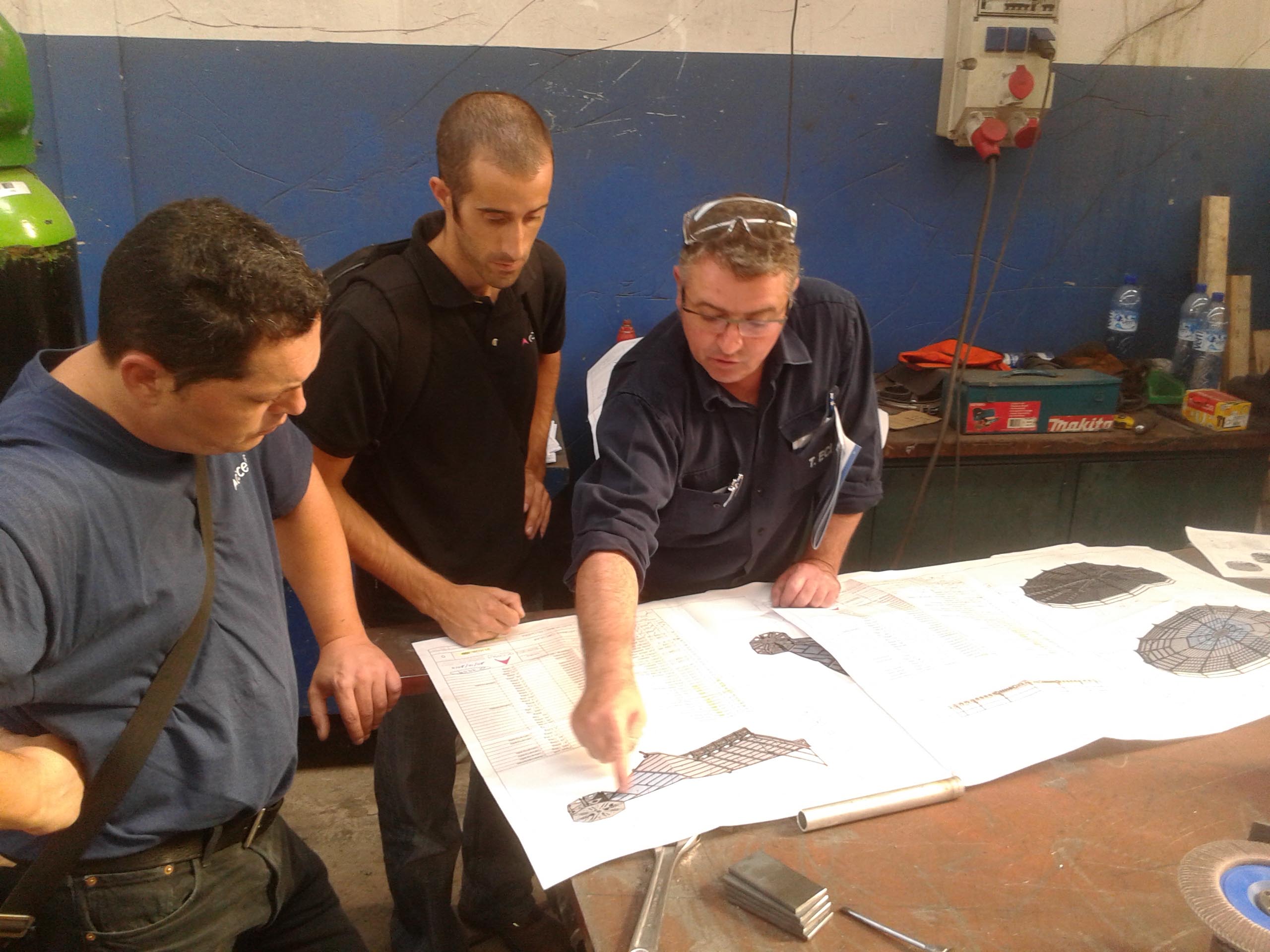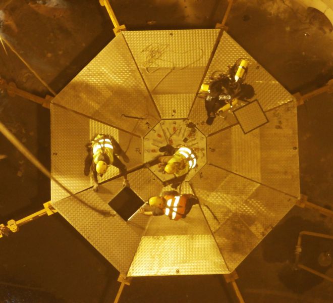 Plateforme suspendue à niveau fixe, modulaire, circulaire amovible. La plateforme est configuré en composants suffisamment réduits pour permettre le passage de tous les équipements démontés à travers le capot. La conception permet de changer rapidament de configuration en différents diamètres pour s’adapter dans chaque dimension au diamètre interne du haut fourneau. De cette manière, une assistance est apportée aux opérateurs pour l’extraction et le remplacement des douelles. Tout l’équipement est suspendu à 8 dispositifs hydrauliques de tirage de câbles.
