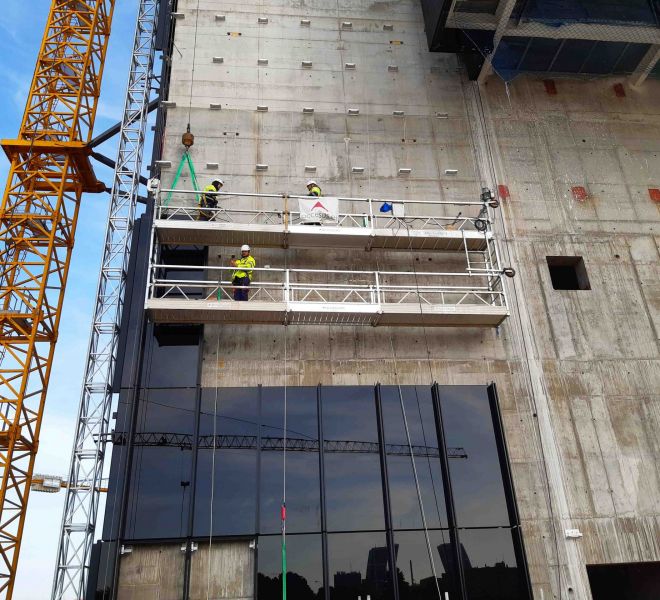 Pour le montage d’une façade ventilée avec des panneaux de 4 mètres de haut, des plateformes suspendues de deux niveaux de hauteur sont nécessaires. Le bâtiment a une hauteur de 200 mètres.
