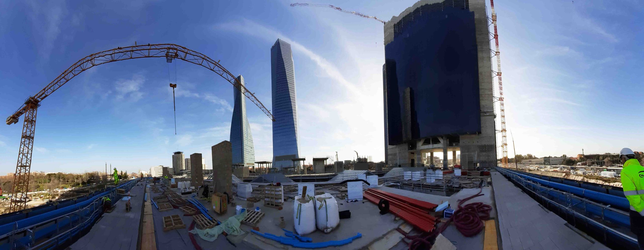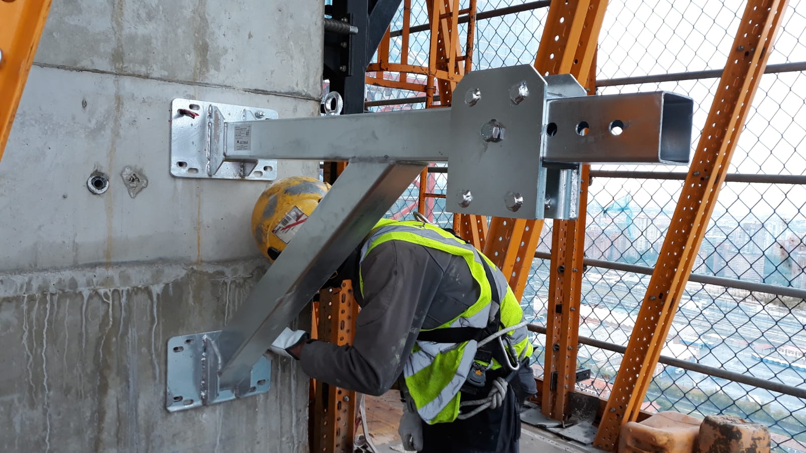 La suspension est d’abord ancrée dans le béton à une hauteur de 130 mètres. Une fois tous les étages bétonnés, les mêmes plateformes sont suspendues à des pinces situées sur la crête. Ce système a permis d’utiliser les plates-formes suspendues avant le couronnement du bâtiment et d’augmenter le rythme de montage de la façade.
