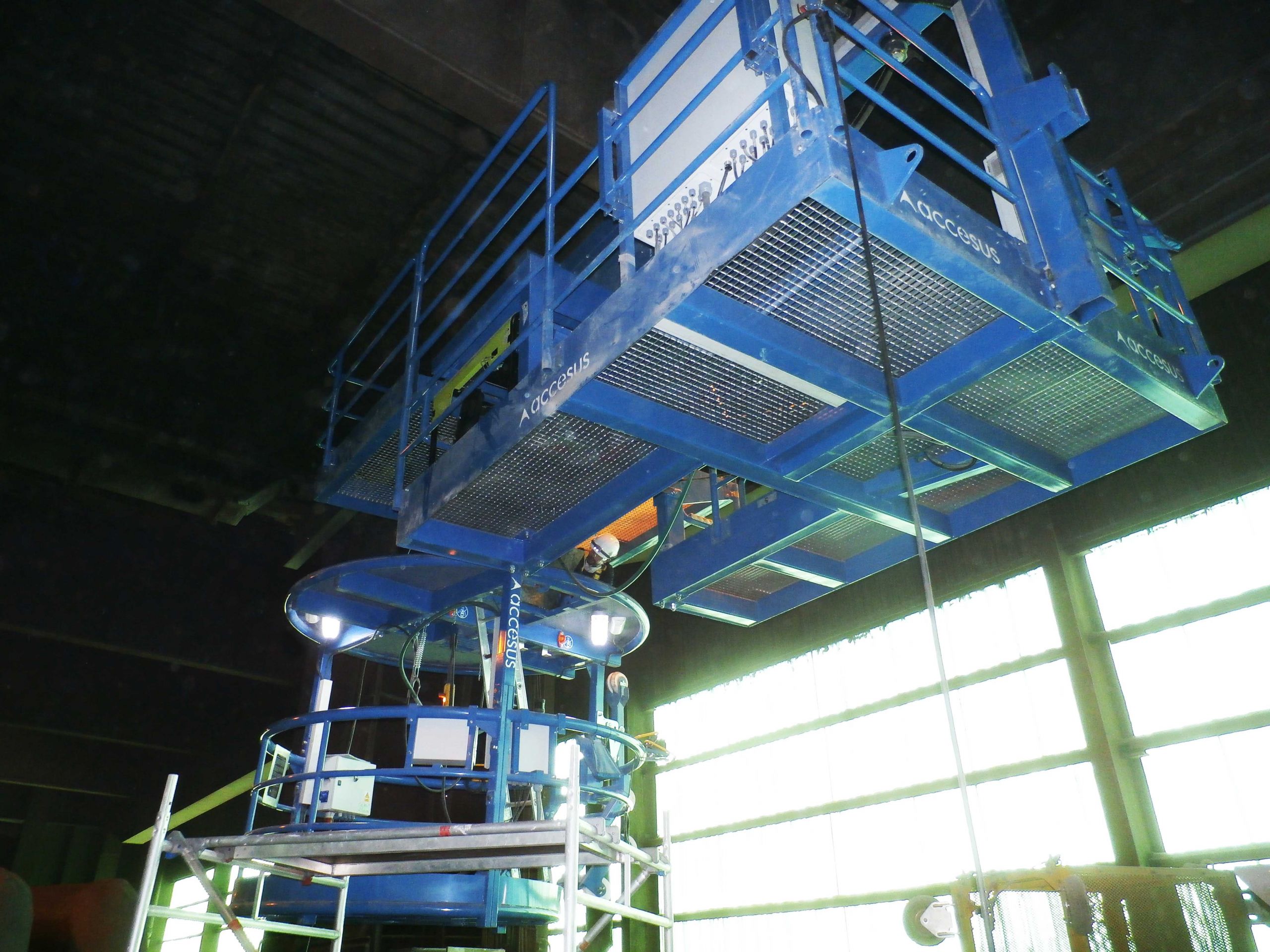Diseño, fabricación, montaje, formación al cliente y mantenimiento anual de una plataforma especial que permita la introducción de personas dentro de los dos convertidores de la caldera de manera segura para realizar los trabajos en todo el conducto.
